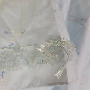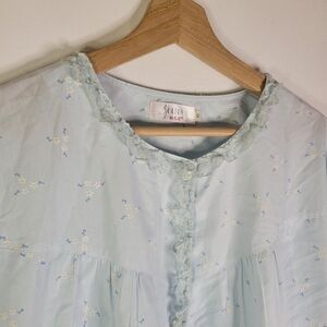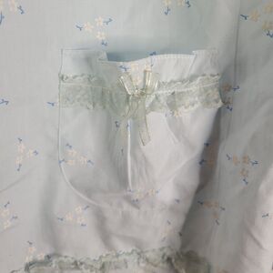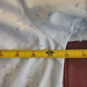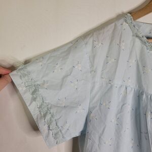 Charming vintage light blue night shirt with floral pattern. Features short sleeves and button-up front, little bow details and a lace frill trim throughout. Lightweight cotton. Perfect for pairing with summer pyjama shorts. EUC