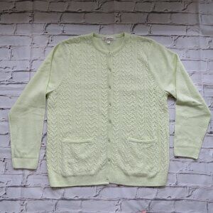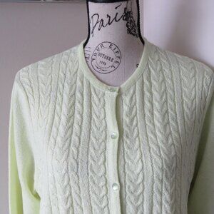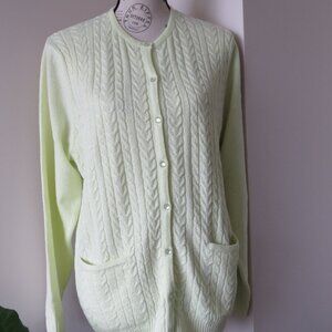 Beautiful light green elegant women’s cardigan. The sweater has some lovely rounded buttons and two open pockets in front. The sweater is a classic style that will never go out of style. The size is a women’s Large or 14 – 16. Fabric is 100% acrylic and fabric is soft to the touch. Brand is Tradition from Sears. Sweater is in excellent vintage condition.
