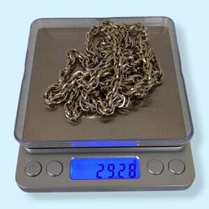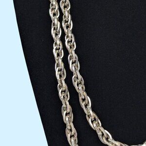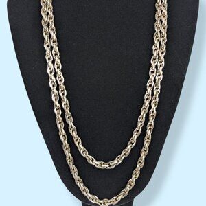 This vintage necklace is made of a light rose gold tone metal with a slight silver tone and does not have an opening/closure. The necklace is a lightweight rope chain, and the links are textured with small dots on their edges. There is minimal wear, and the piece is in good condition. The last picture shows this chain in the center with a silver tone chain on the right and a gold tone chain on the left. The rose gold tone is much more visible in person.