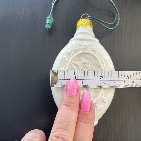 Bisque porcelain with cherub impression on both sides of the ornament.