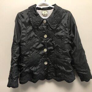 As can be seen from the pictures, this Jacket has beautiful detail and design. It has a slightly puffy look to it, is very lightweight, and is incredibly soft to the touch. This April Cornell Jacket appears to have been made around the 1990s and is in great condition. It has scalloped edges along the bottom of the Jacket, as well as the ends of the Sleeves. The buttons appear to be some sort of shell that reflects much like "mother of pearl".