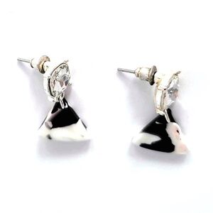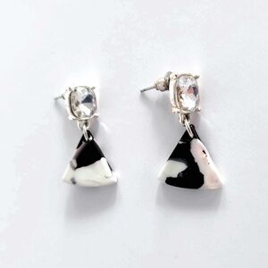 Uniquely design in a lightweight acrylic post earring has a black, grey/pinkish and white graphic design and a geometric triangle shape.
