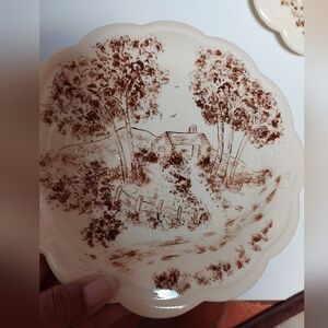 Scalloped edge. Approx 9" diameter. Reddish brown country scenes on cream ceramic plates. 70s. Lilja