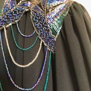 Great for the Holidays, this stunning vintage Lillie Rubin dress is a bold luxurious fashion statement. With a silk/crepe under-slip, and elaborate hand-beading on the shoulders and front, tiered skirt.