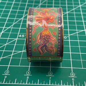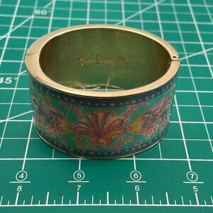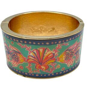This cuff bracelet is set in gold tone while showcasing vibrant orange, teal, yellow and aqua colors. Signed Lilly Pulitzer, this piece will be the perfect beach accessory. It is in great shape with a very good quality hinge and magnet. Colours are vibrant.
