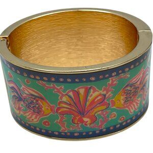 Vintage Lilly Pulitzer Shell and Fish Enamel Cuff Bracelet Signed Designer Clamp