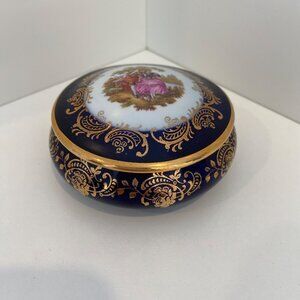 Vintage Limoges Round Porcelain Jewelry Box With Romantic Scene & Gold Detailing