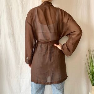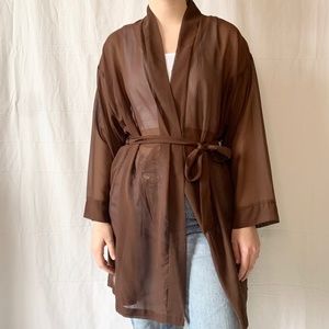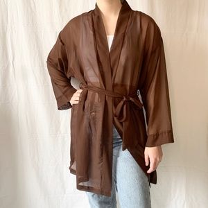 Features a tie belt to style in many different ways, with long sleeves. Lightweight sheer fabric. This chocolate brown sheer robe is perfect for all four seasons. Style it with jeans and a tee in the spring, over your bathing suit in the summer, and with a turtle neck for the fall and winter. It has an interior tie to keep it tied shut, as well as the belt tie.