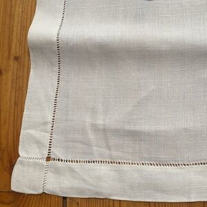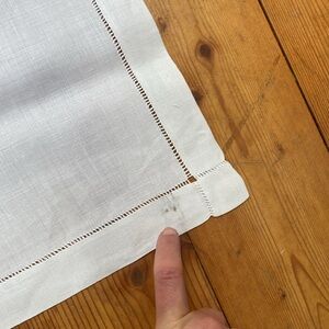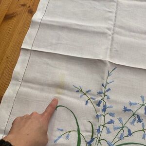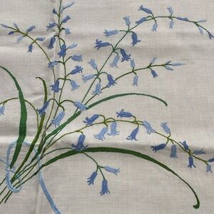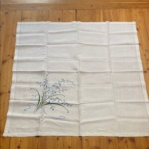 Almost square! 44.5” x 43 “ Hand embroidered vintage linen tablecloth that was my gran’s. I received an entire steamer trunk of linens and I’ve kept the ones that fit my table but there’s too many to hoard them all. Would love to connect these with someone to enjoy/repurpose. There is a spilled tea stain on this one that might be treatable with oxy clean? Or someone that knows how to handle vintage linens might be able to comment.
