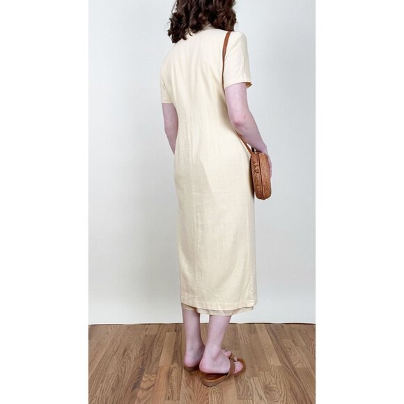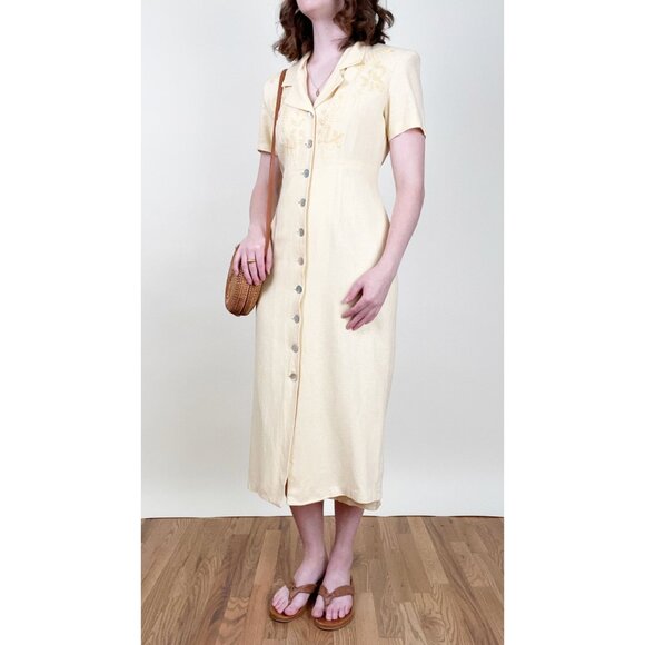Vintage Linen Floral Embroidered Button Up Down Midi Dress Summer Sun Sundress