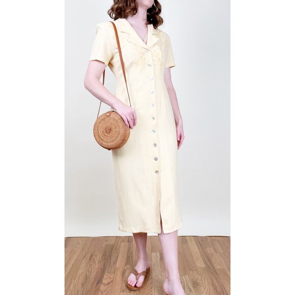 Vintage Linen Floral Embroidered Button Up Down Midi Dress Summer Sun Sundress