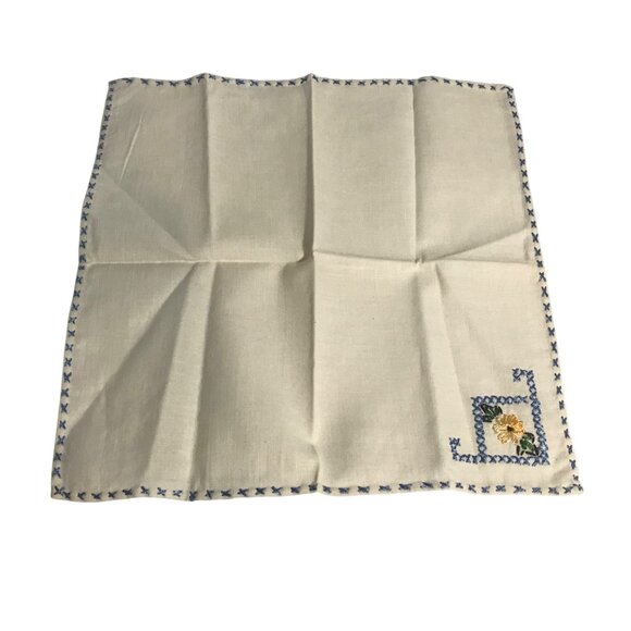 Classic white linen handkerchief with meticulous hand-embroidered blue cross-stitch border, featuring a detailed floral design in one corner. Ideal for collectors.