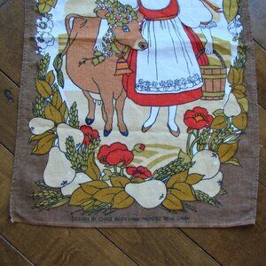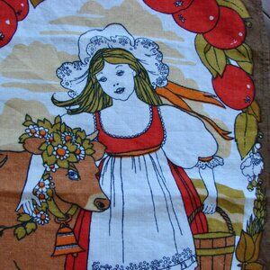 - cute vintage tea towel features a milk maid with her cow, flowers and fruit