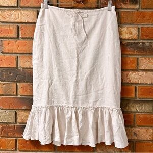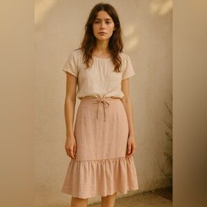 Vintage Linen Pale Pink Midi Skirt with Ruffle Hem + Adjustable Waist