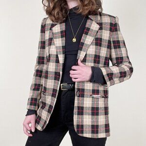 Vintage Linen Plaid Oversized Blazer Jacket Pea Coat Preppy Academia Old Money