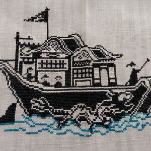 Vintage Linen Tablecloth & Napkins Set Black Cross Stitch Dragon Boat Pagoda