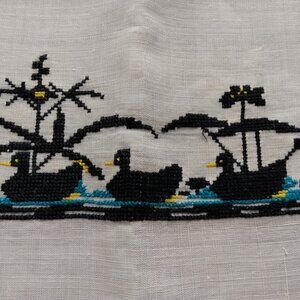 The tablecloth features cross stitch designs of a dragon boat with fishermen aboard and a scene with ducks.