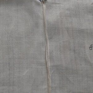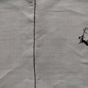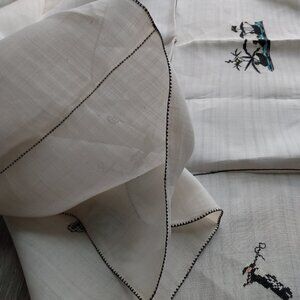 Good used vintage condition with noticeable wear from use and age. There are a couple of areas of discoloration in the middle of the tablecloth - could be from the dye in the embroidery floss? There is also some uneven yellowing, small holes, picks and what looks like puckering. The napkins are a deeper shade than the tablecloth. I have not tried to remove any spots or clean any of it. This set is sold in as is condition.