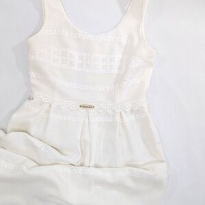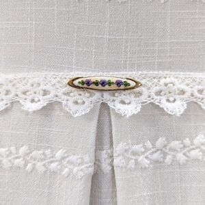 Heavy weight white linen with cotton floral embroidered striping. The skirt is lined with organdy, an absolute dream textile. I am guessing circa 1960 ish. You will notice that the bodice is just slightly above the waist & of course the original zipper was metal.