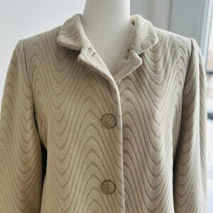 A refined and gorgeous vintage coat by Toronto label Lisa Fashion, crafted in Canada from a luxurious angora and wool blend. The rich cream fabric is finished with a distinctive raised wave texture that adds depth and quiet drama to the silhouette. Designed with a structured stand collar, sculptural seaming, and thoughtful tailoring details, this piece reflects the high standard of Canadian boutique outerwear produced in the late 1980s to early 1990s—an era known for quality materials, domestic manufacturing, and enduring design.