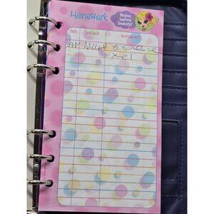 Homework pages- 5 pages front and back printed. One of them has writing on the front. A few have some tears near the hole punch holes.