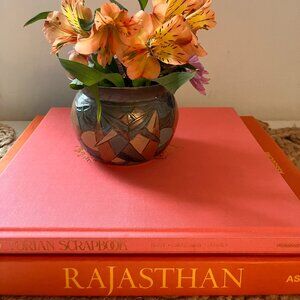 Little Brass Pot - Embossed - Featuring Abstract Geometric Design in Coral, Blue and Beige Shapes