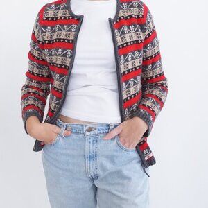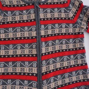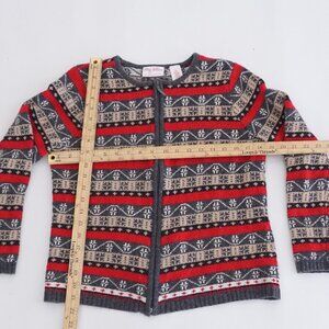 Vintage Liz Claiborne Grey Knit 10% Wool w Red Design Zip Up Cardigan Sweater S