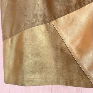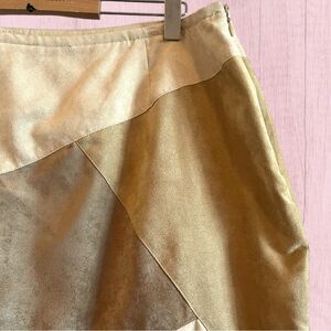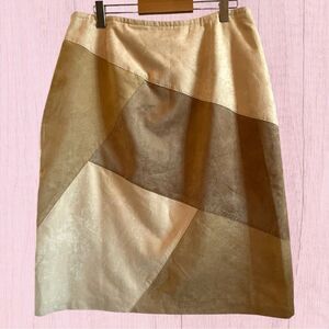 Beautiful vintage 90s faux suede skirt from Liz Sport. Super soft microsuede fabric in neutral toned patchwork. Side zipper. High waisted, hits above the knee. Super chic with a turtleneck and knee high boots. Size 10, fits true to size. Excellent condition.