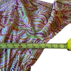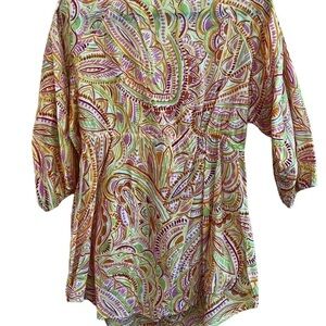 In excellent pre-owned condition, gorgeous multi-coloured pattern, 100% Cotton, cinch string waist, 3/4 sleeves, size 1X, see measurements.