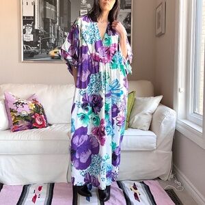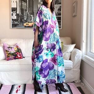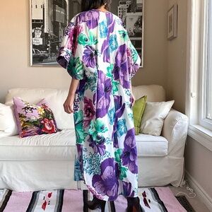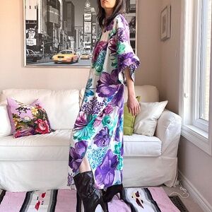 V-neck. Piping details. Single right hand side pocket. Rounded side slit. Small stain at front hem( see pic). Gathers at front at bottom of V-neck. Labelled one size. Approx 53in length, 18.5in item collar to cuff, 35in pit to pit. Small stain in front(see last pic).