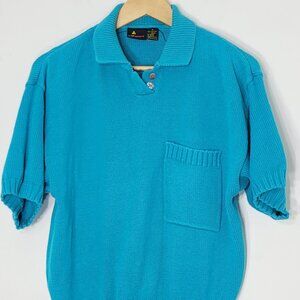 Vintage LizSport Blue Short Sleeve 100% Cotton Collared Pocket Retro Sweater Y2K