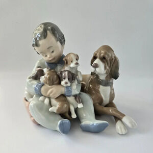 Vintage Lladro Boy Child With Dog & Puppies Figurine #5456 Porcelain Figurine