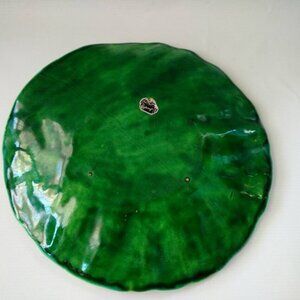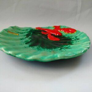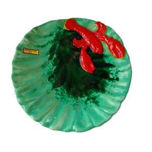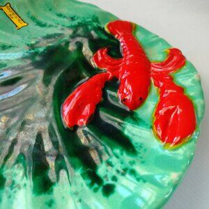 Brightly colored decorative dish in shades of green featuring a raised red lobster.