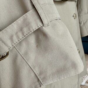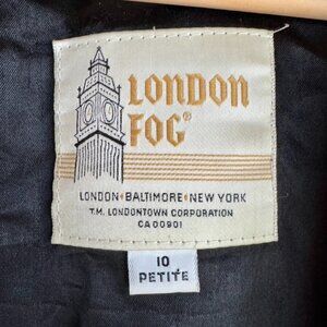 Vintage London Fog short winter trench coat, size 10P. A gorgeous classic. Tartan wool liner w nylon/poly sleeves removable with zipper. Very warm! Adjustable belt and sleeves. A few small marks on arms as shown in photos 6 & 7. Bust measures 21 inches laying flat, waist 16 inches, hips about 22.5 inches, and length from shoulder to hem is 30 at the front, 31 inches at the back. Cat friendly, nonsmoking home.