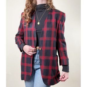 Stunning vintage long oversized single button plaid blazer jacket by Jones New York. Very high-quality piece perfect for this fall & winter, and for transitioning into the spring. Looks great with jeans and a graphic tee, over a simple dress, or paired with a turtleneck sweater and some high-waisted trousers. Guaranteed to get you many compliments whenever you wear this piece!