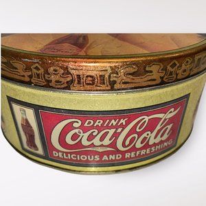 Vintage Look Round Coca-Cola Tin Lady Hat Drinking Bottle Gold Red Collectible Container Canister Advertising