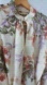 a vintage floral blouse by Lori Ann. It has a high neckline with a keyhole opening and a single button closure at the front. The blouse features long sleeves and a drawstring hem. The fabric is a lightweight, possibly semi-sheer material with an all-over floral print in shades of red, purple, and green on an off-white background. a pleated skirt with a floral print, designed by the brand Lori Ann. The skirt features a light, off-white or cream-colored background, adorned with a pattern of flowers in shades of pink, purple, and green. The pleats are vertical and run the length of the skirt, giving it texture and movement. The fabric appears lightweight, suggesting it might be suitable for warmer weather or occasions. The "Lori Ann" label is visible on the inside of the collar. Lori Ann is a clothing brand that was popular in the 1970s and 1980s.