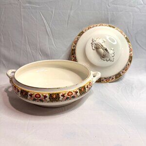 A beautiful vintage small covered dish by Losol Ware Keeling & Co made in England. It is 8" x 4" mainly white with yellow trimmings. In the middle of the dish there are multi coloured floral patterns, and is made from porcelain. Has been previously owned.