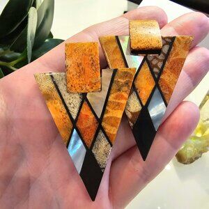 The silver hatched triangles and gold glitter hoops are a lightweight yet solid, thick acrylic. The triangular mosaic pair seem to have a lightweight black back layer and an acrylic patterned top layer.