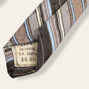 This vintage tie by Louis Feraud Paris is made of 100% polyester and originally cost $8.50. The interior of the tie appears to have originally been off-white, but the tie shows its age most in the ends. The pattern is a series of stripes in brown, taupe, yellow, and a strangely complementary light blue. There is a tag inside the thin end and a maker's tag across the back of the thick end (behind which you can tuck the thin end). There is slight pilling in the fabric that I'm happy to shave off upon request, but I've left it for now. The tie has vintage wear but is still wearable.