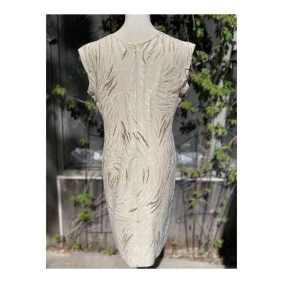 Stunning Ivory Shift dress with gold animal print pattern. 100% Cotton self with gold satin lining. Cap sleeves, V neckline. Rear zip closure. Two sealed front waist pockets. No stains, holes or tears. Pet and smoke free studio.