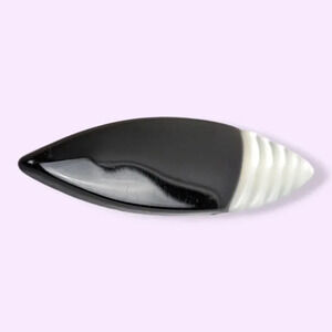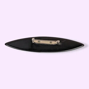 This vintage mid-century brooch is made of black lucite with a pearlescent insert (acrylic or acetate) and is shaped like a long oval. A little more than half of the brooch is black and smooth, and the remainder is a pearlescent white with diagonal lines running through it. The brooch has a modern locking c pin closure on the back and has signs of wear throughout, like the superficial scratches in the black plastic. Despite that, this piece is in good condition overall.