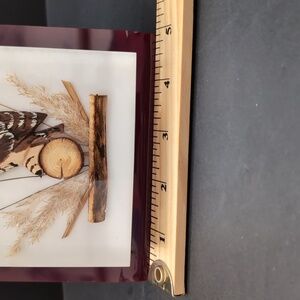 Vintage Lucite Encased Carved And painted Owl In a Maroon Frame.