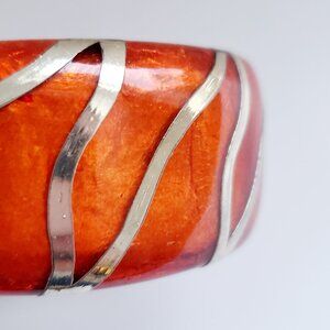Stunning chunky bracelet with what appears to be clear lucite covering an orange foil-like underlay with asymmetrical silver tone diagonal stripes