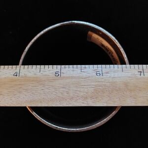 Heavy brass bangle. Engraved with a Navajo rug design. Enamel. Cream colour enhanced with black and brown. Approx 2.75" diameter. Lucky Brand.
