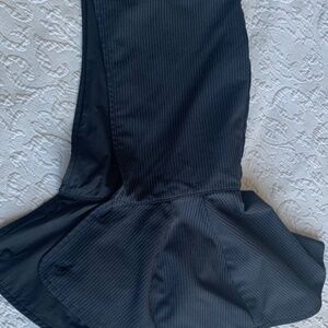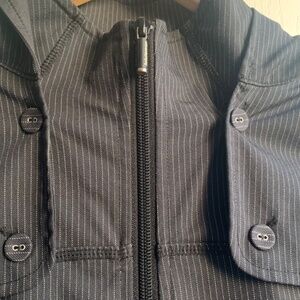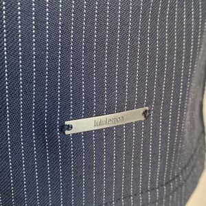 Very flattering fit with grey and white pin stripes, lands at about hip bones (I’m 5’3”) so it’s not the long fit that Lulu zip-ups now tend to have.