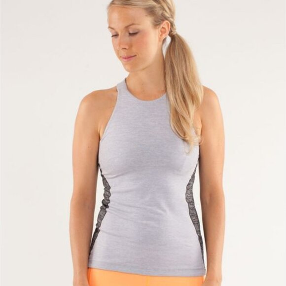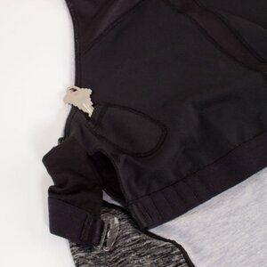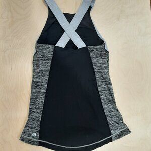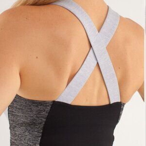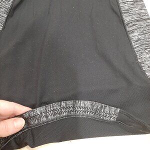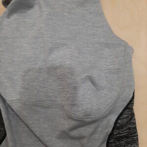 From an older collection, and features a really beautiful heathered grey and contrasting heathered black with halter neckline. Their is a built in shelf bra that has pocket for key and also removable padding openings. There a silicone anti slip design on the inside of the back hem of the top so it doesn't move while you work out. It's slightly longer in the back than in the front.