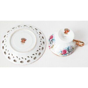 Both the cup and reticulated saucer are in excellent condition with no chips, no cracks, and the glaze has a nice gloss.