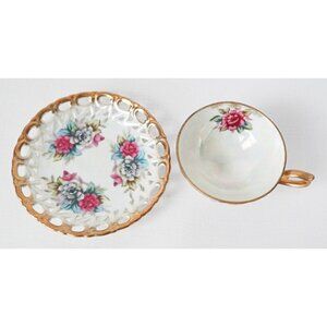 Both the cup and reticulated saucer are in excellent condition with no chips, no cracks, and the glaze has a nice gloss.