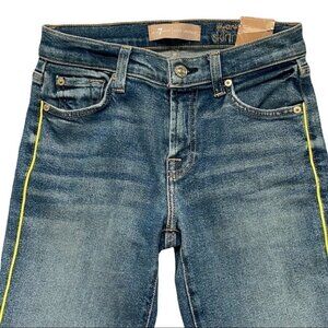 Ankle skinny mid rise jeans with neon piping. Very soft and stretchy.